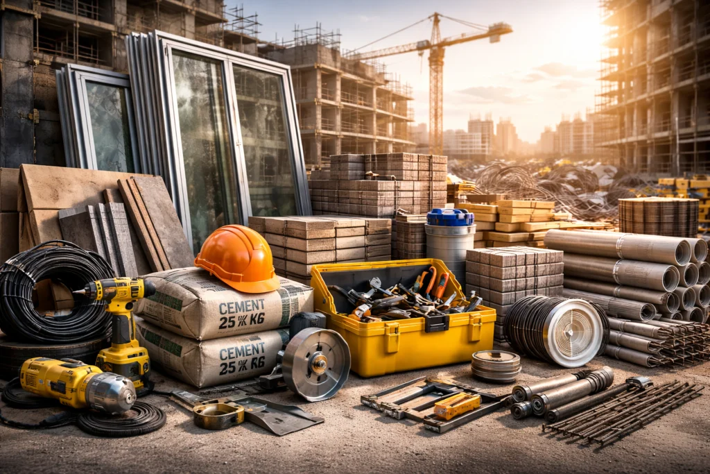ייבוא של ציוד קבלני, כלי עבודה וחומרי גמר לפרויקטים, כולל מתכות, פרופילים, ריצופים, דלתות, אלומיניום, תאורה טכנית וציוד לאתרי בנייה, עם דגש על עמידות, התאמה לסטנדרטים מקצועיים וליווי מלא.